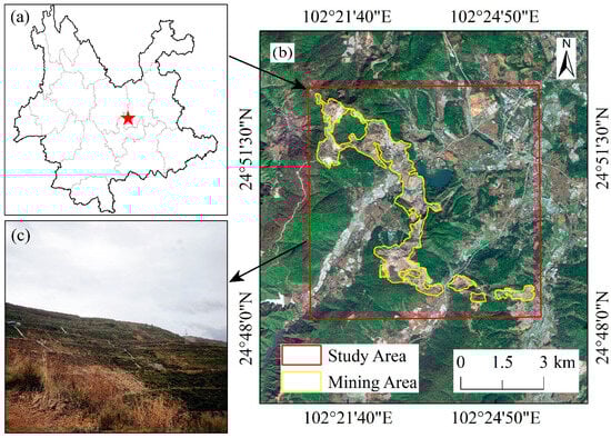 Overview map of the study area. (a) The approximate location of the study area (The red star) in Yunnan Province, China; (b) The extent and specific positioning of the mining area; (c) A field photo of a slope at an abandoned soil disposal site in the mining area.