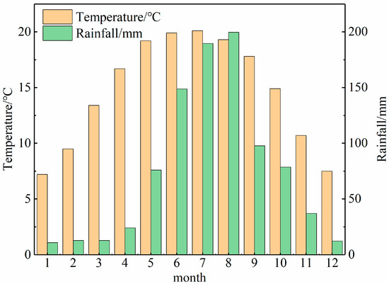 According to data from the Anning Meteorological Bureau, the average annual temperature in the mining area is 14.7 °C, with ample and evenly distributed sunshine. The hottest month is July, with an average temperature of 20.1 °C, while the coldest month is January, with an average temperature of 7.2 °C. The average ground temperature over the years is 18 °C, with an average of 225 frost-free days per year. The average annual rainfall is 886.5 mm, ranging from a maximum of 1161.8 mm to a minimum of 553.9 mm. The rainy season (May to October) accounts for 87% of the annual precipitation, while the dry season (November to April) contributes 13%, as shown in Figure 2.