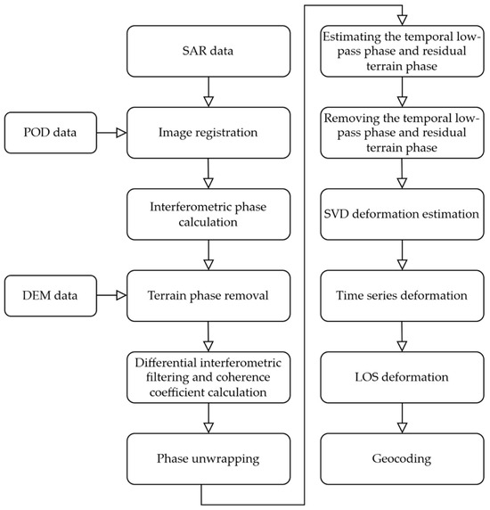 Utilizing Singular Value Decomposition (SVD) to analyze N differential interferograms, thereby deriving deformation velocity values for different SAR image time series. The specific processing steps are shown in Figure 3.