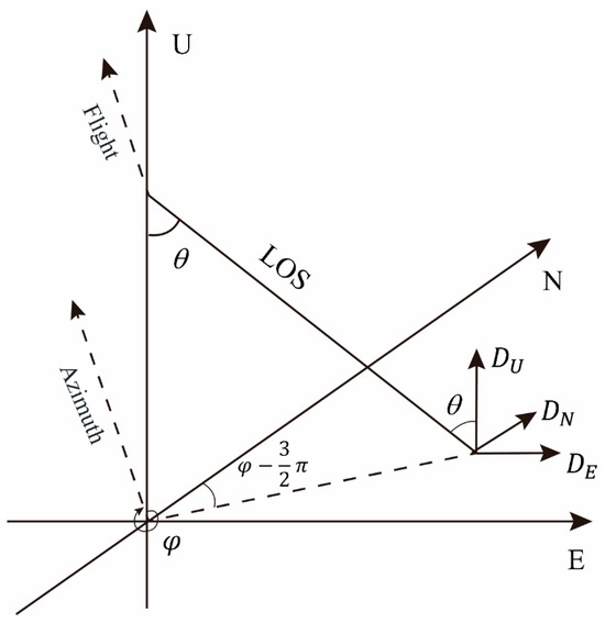 To obtain the two-dimensional surface deformation field, the relationship between InSAR observations and the vertical and horizontal east–west deformation components is first analyzed. The spatial geometric characteristics of SAR satellite observations are shown in Figure 4.