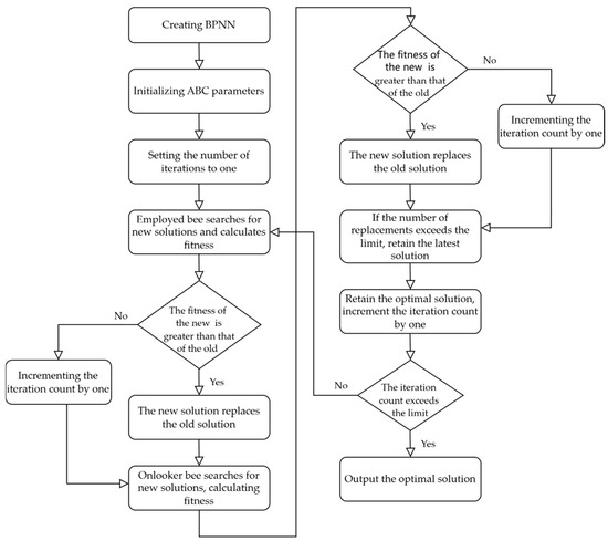 - Set the initial weights and thresholds of the BPNN according to the solution dimension (D). Define the position of the i-th employed bee’s random search solution as , and search for new solutions in its vicinity and record the positions.In the equation, represents the lower bound of the search range for the j-th element of each solution while represents the upper bound of the search range for the j-th element of each solution.