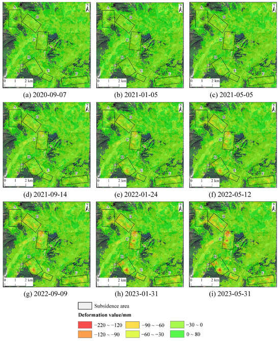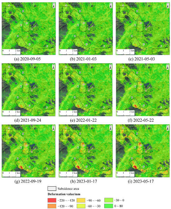 The temporal cumulative deformation from the descending orbit images is shown in Figure 10. From Figure 10, it is clear that each subsidence zone began to exhibit noticeable subsidence and gradually expanded from 10 May 2020, to 12 May 2022. The cumulative subsidence within these zones showed an increasing trend during this period. From 12 May 2022, to 31 May 2023, the expansion of the subsidence zones gradually ceased, but the cumulative subsidence continued to increase. Among these, zone C recorded the highest maximum subsidence value, approximately 158 mm. Zone A had a maximum subsidence value of around 110 mm; zone B, around 115 mm; zone D, around 141 mm; zone E, around 105 mm; and zone F, around 124 mm.