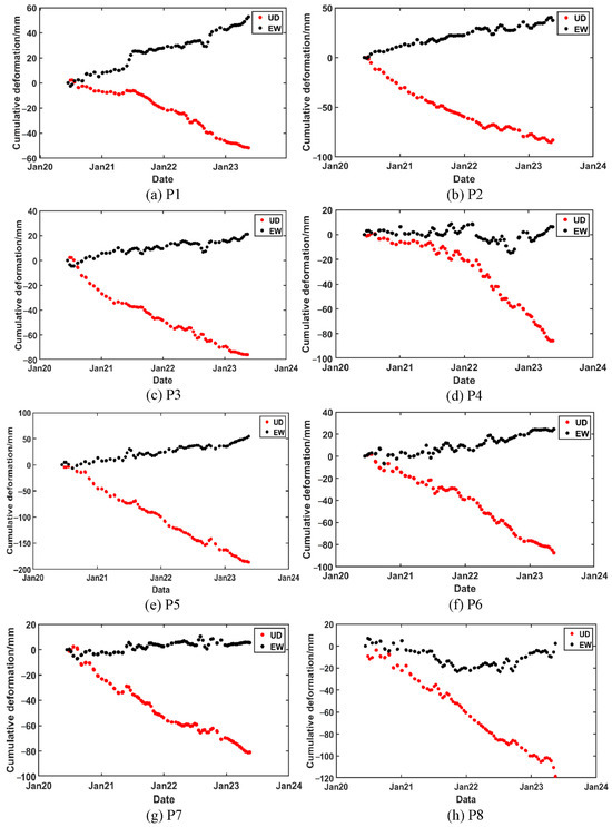 Figure 12 shows the 2D deformation values over time for the selected points. The vertical and east–west deformation trends for each point exhibit significant differences. Due to the varying degrees of subsidence, each point effectively reflects the subsidence trend in its respective area, providing good representativeness. Therefore, P1 through P8 can be used as predictive points for future subsidence analysis.