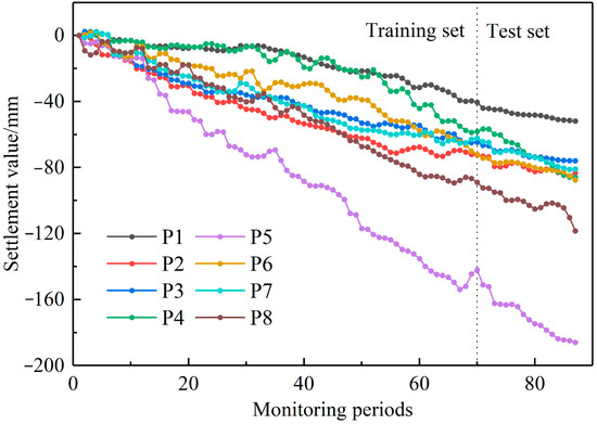 Based on the vertical subsidence values from the time series in Figure 11 (corresponding to the red points), the 87-period data of the eight predictive points were split into training and testing sets in approximately an 8:2 ratio. The first 70 periods were used as the training set input for the prediction model, while the subsequent 17 periods formed the testing set, as illustrated in Figure 13.