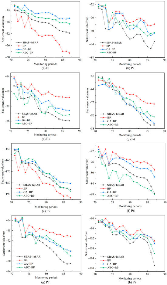 This study uses MATLAB R2022a software to conduct subsidence prediction experiments in mining areas. To compare and verify the predictive capability of the BPNN model, two optimized models, GA-BP and ABC-BP, were further used to predict eight characteristic points. The comparison between SBAS-InSAR monitoring values and the predicted values from the BPNN, GA-BP, and ABC-BP models is shown in Figure 14. Among the predictions for the eight characteristic points using the BPNN model, the predictions for points P1 and P2 are more accurate, with MAEs less than 4.3 mm and RMSEs less than 4.6 mm. However, the prediction accuracy for points P4 and P5 is relatively poor compared to points P7 and P8, with MAEs greater than 6.3 mm and RMSEs greater than 7.1 mm.