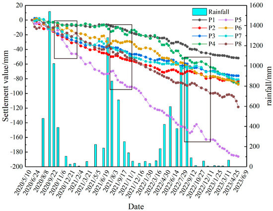 Among the subsidence points, P3, P4, P5, P6, P7, and P8 show rapid subsidence. In contrast, the P1 and P2 subsidence points exhibit relatively gradual subsidence, but the subsidence rate sharply accelerates from May to September 2022. As seen in the figure, the study area experienced abundant rainfall from May to September 2022, with the highest monthly rainfall of 1009.9 mm occurring in August. This indicates that the excessive rainfall during this period caused the accelerated subsidence at the P1 and P2 points.