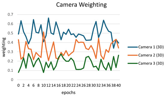 An example of 2D–3D consistent restricted camera-aware weighting for three cameras of the Wildtrack dataset. The weight order changes multiple times during the training; in this case, the QBL scheduler activates at epochs 11, 12, and 39.