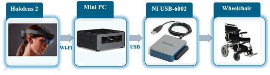 The constitutive elements of the system are an untethered mixed reality headset, a mini-PC, the NI USB-6002 DAQ board, and the wheelchair. The technical characteristics of each of the electronic devices used are listed below.