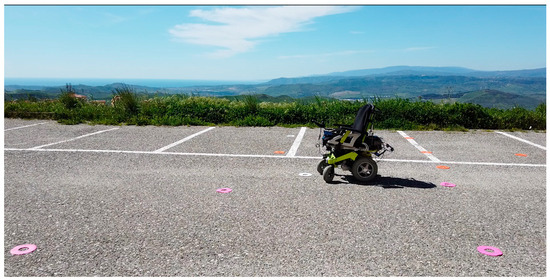 The participant drove the wheelchair three times in an analogue manner using the device’s proprietary joystick; the same participant carried out the test three more times using the HoloLens 2 device and moving the motorized wheelchair, as depicted in Figure 5.