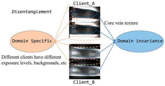 Example diagram illustrating the necessity of decoupling. Finger vein images can be divided into two parts: background and foreground information. In this paper, we refer to them as domain-specific and domain-invariant information, respectively. The former reflects the personalized information of specific datasets, such as exposure and imaging conditions for different clients. The latter refers to the core vein texture, which is common and is the key feature for finger vein recognition technology.