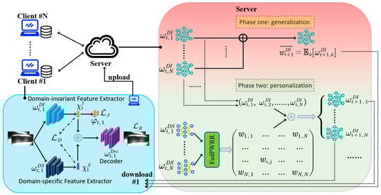Next, the second decoupling of the model—feature decoupling—is performed. This involves extracting domain-invariant and domain-specific features from finger vein images using two corresponding models. After the first decoupling, the trained feature extractor parameters still contain considerable domain-specific information related to the background information and image noise in the finger vein images. These features vary significantly among the finger vein datasets of different clients. Directly aggregating these coupled feature extractor parameters is not conducive to improving model generalizability. Inspired by [14], this paper introduces domain disentanglement learning. The feature extractor of the k-th client (k = 1,2,…,N) is divided into two parts: domain-invariant and domain-specific . This approach decouples the feature representations in the client’s dataset into domain-invariant and domain-specific features. The domain-invariant model parameters are uploaded to the server to train a global model with strong generalizability. Moreover, both the classifier φ and domain-specific model parameters are kept local to capture the distribution characteristics of the local dataset. These can be used in the second stage for client similarity measurements.