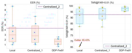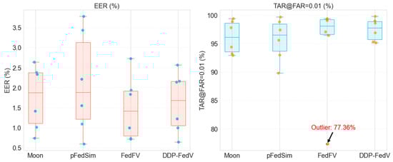 The average TAR@FAR = 0.01 of the DDP-FedFV method was 97.46%, which was 1.394%, 1.817%, and 2.838% greater than those of Moon, pFedSim, and FedFV, respectively, indicating an improvement in overall performance. The worst EER of the DDP-FedFV method was 2.563%, which was 2.769%, 32.178%, and 6.152% lower than that of Moon, pFedSim, and FedFV, respectively. The worst TAR@FAR = 0.01 of the DDP-FedFV method was 95.15%, which was 2.356%, 5.946%, and 22.996% greater than those of Moon, pFedSim, and FedFV, respectively. This demonstrates that our algorithm can maintain good performance even for clients with considerable heterogeneity, showing robust overall performance. Moreover, the boxplot in Figure 7 reveals that the models of each client obtained using our algorithm show good performance, with low overall variability and more stable performance. These results collectively prove the superiority of the DDP-FedFV method over existing algorithms.