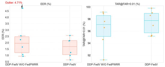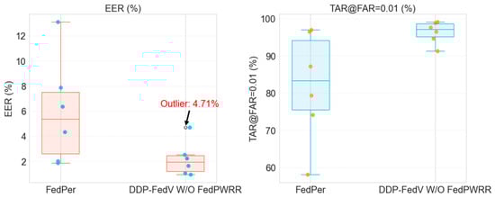 Furthermore, the boxplot in Figure 6 reveals that the model trained without the FedPWRR method exhibits high variability, with the EER metric for the VERA client classified as an outlier. This shows that the method without the FedPWRR method has greater variability, with the models for some clients showing considerably poor performance. In contrast, the DDP-FedFV metric data are more concentrated and denser, and the median metrics are clearly improved compared to those of the algorithm without the second stage. This visually demonstrates the effectiveness of the proposed FedPWRR method and the rationality of the two-stage training paradigm.