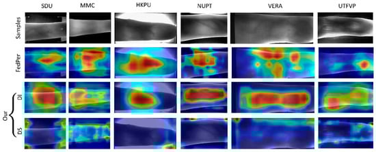 To extract more representative finger vein features, deep learning algorithms have become the mainstream feature extraction methods in finger vein recognition, considerably improving recognition accuracy [1,2,3,4]. Training a robust deep learning model typically requires a large amount of finger vein image data [4,5]. However, due to privacy protection laws [6,7,8,9], research institutions and companies cannot collect or share extensive finger vein datasets. As a result, these organizations can train models using only limited local data, leading to suboptimal accuracy and generalizability. Federated learning (FL) addresses this issue by enabling multiple clients to collaboratively train a model while ensuring data privacy and security. FL methods facilitate the training of high-performance models without sharing datasets, aligning with the privacy and high-accuracy requirements in biometric recognition, and thus shows great application potential. Currently, FL methods have been applied in areas such as facial recognition [10,11,12,13,14] and iris recognition [15,16]. However, research on finger vein recognition remains limited. Only one published study has proposed FedFV [17]. However, in this study, only the size of the dataset for each client was used to calculate the aggregation weight matrix, while the heterogeneity among clients’ finger vein datasets was not considered, resulting in significantly different performance across clients.