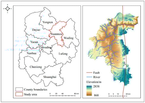 This study is conducted in the Yuanmou dry-hot valley, located in the Chuxiong Yi Autonomous Prefecture, Yunnan Province, China (25°21′ to 26°6′ N, 101°35′ to 102°6′ E), as shown in Figure 1. Positioned in the northern part of the Yunnan Plateau and the eastern section of the Hengduan Mountains, the Yuanmou dry-hot valley lies downstream of the Longchuan River, a major tributary of the Jinsha River [27,28]. The terrain is a typical high-mountain canyon, surrounded by high elevations with a central valley that dips to a lower altitude. Elevations range from 868 m to 2838 m, with a relative height difference of 1970 m. The region is crossed by the Yuanmou fault zone, which runs north to south, characterized by numerous fault planes and fractured zones [29], creating diverse landforms such as basins, hills, and plateaus [30].