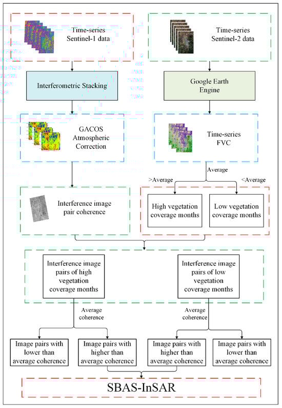 The overall technical route of this study is shown in Figure 2, and the main technical processes include the following: (1) interference superposition and GACOS atmospheric correction based on Sentinel-1A data, (2) pixel bipartite FVC calculation based on Sentinel-2 data, and (3) baseline optimization and SBAS-InSAR surface deformation information retrieval.