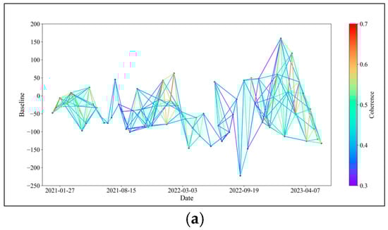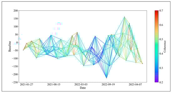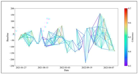 In this study, we considered changes in surface vegetation coverage and categorized interferometric pairs into those formed during months of high vegetation coverage and those formed during months of low vegetation coverage. We then applied Equation (9) to exclude pairs from each category accordingly. Among them, 64 pairs formed during high vegetation coverage months were excluded, and 74 pairs formed during low vegetation coverage months were excluded. The optimized baseline network is shown in Figure 6.