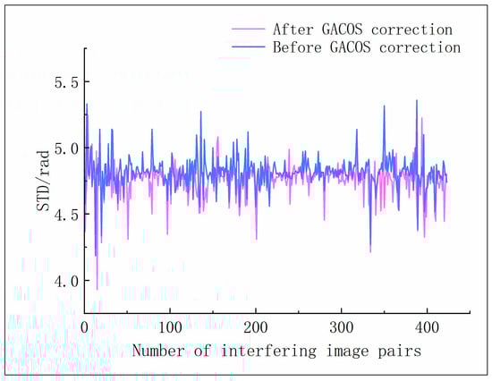 We download GACOS products corresponding to each SAR image acquisition to apply atmospheric delay phase correction to the generated interferometric pairs. Notably, not all GACOS products can effectively correct every interferometric pair; in some cases, they may even increase phase delay errors [43]. The phase standard deviation (STD) is used as an indicator to assess the effectiveness of atmospheric correction. As shown in Figure 4, after GACOS correction, out of 423 interferometric pairs, the STD decreased in 362 pairs (85.6%), while the STD increased in 61 pairs (14.4%), with the maximum increment being only 6.8%. Overall, in the Yuanmou dry-hot valley area, GACOS data effectively improve the phase errors induced by atmospheric delays.