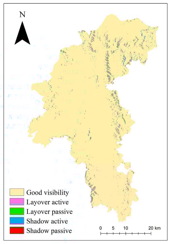 In order to ensure the accuracy of InSAR monitoring, according to the radar satellite parameters, the radar visibility analysis of the study area was carried out based on the LSM (Layover and Shadow Map) algorithm to identify the geometric distortion area, and the results are shown in Figure 7.