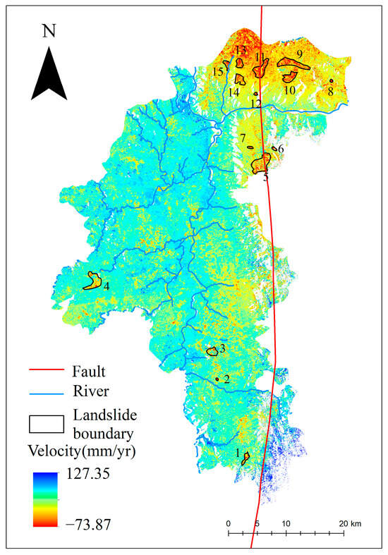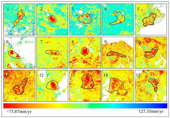After applying GACOS atmospheric correction, OM-InSAR-BCCVC baseline optimization, and geometric distortion region masking, the radar line of sight (LOS) deformation rates for the Yuanmou dry-hot valley from January 2021 to May 2023 were obtained, as illustrated in Figure 8. The overall deformation rate ranged from −73.87 mm/yr to 127.35 mm/yr, where a positive rate indicates uplift toward the satellite and a negative rate indicates subsidence away from the satellite. Fifteen landslides and potential landslide areas were identified and numbered from 1 to 15, with detailed deformation information depicted in Figure 9.