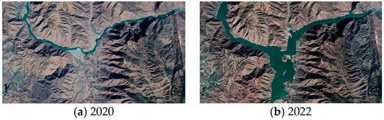 Google Earth satellite image comparison of the confluence of the Jinsha River and the Longchuan River (a) before the water level rises, and (b) after the water level rises.