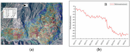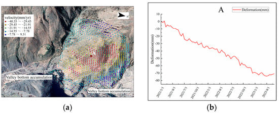 Landslide creep variant 15: (a) deformation rate points, and (b) time-series deformation curves.
