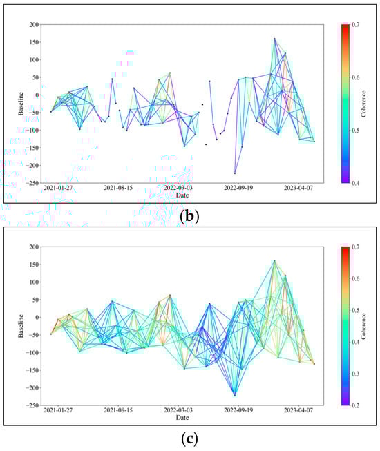 Baseline connection diagram of the following three methods: (a) the method of this article, (b) the average coherence coefficient threshold method, and (c) no baseline optimization.