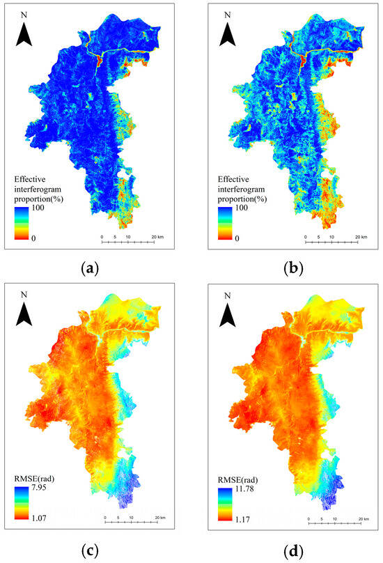 Comparison between the method in this paper and the method without baseline optimization: (a) the effective interferogram scale for the method in this paper; (b) the interferogram scale that is not optimized for baseline; (c) the inversion error of the method in this paper; and (d) is the inversion error without baseline optimization.