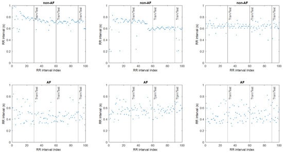 Figure 1 shows typical sequential RR interval differences between non-AF and AF recordings over time. The recordings are divided into 30 RR interval sections for the training and testing sets. The variation in RR intervals within each sequence is significant between the two categories as generally irregularity is seen to increase in the case of AF. However, this irregularity can sometimes occur in non-AF-labeled sequences as well (for example, Figure 1, top right). Therefore, a simple time-invariant feature, such as the RR interval standard deviation, is insufficient for accurate AF classification due to the difficulty in establishing a universal threshold across large populations. As such, a model that can focus on time-varying features as a biomarker for AF is the focus of this study.