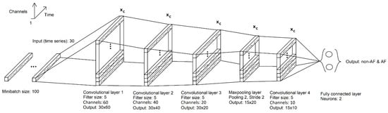 CNNs are widely used in computer vision tasks, image classification, object detection, and segmentation [31]. One-dimensional CNN variants have also shown excellent performance in time series classification [32] and typically consist of an input layer that takes a fixed-length sequence of the time series (in this case a series of RR intervals), followed by one or more convolutional layers that apply filters to extract temporal features from the input sequence (Figure 2). These learnable filters are adapted to shared weights trained through backpropagation and gradient descent (see Section 7), allowing automatically discover relevant features in the data. This is followed by a pooling layer, which down-samples the feature maps to distil the most salient elements. The flattened output of the pooling layer is then fed into one or more dense (fully connected) layers that interpret the extracted features and produce the final classification output.