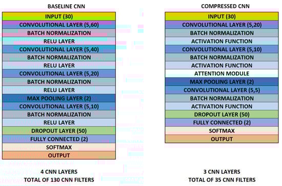 The baseline (left) and compressed CNN with attention modules added (right). The baseline CNN has four convolutional layers, whereas the compressed version has three smaller layers with an attention mechanism—either an SE or ATAC module.