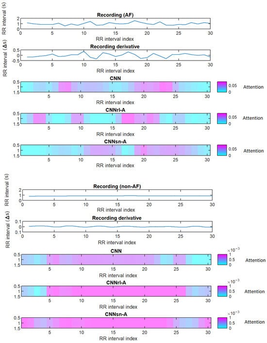 To understand how attention is being used by the models, Figure 7 shows the gradient-weighted class activation mapping map of the classification score change based on the classification score’s gradients for the final convolutional layer for two example recordings (non-AF and AF). It shows at which point of a recording the models attend the most. Using an attention mechanism and choice of activation function, both change the attention focus compared to the baseline model. In the AF example (Figure 7, bottom) we see that CNNrl-A attention modulation correlates with RR interval changes seen in the derivative plot. Furthermore, the choice of activation function had a significant effect on changing that focus.