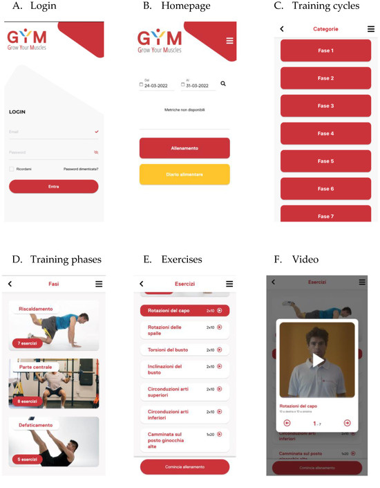 The smartphone application is available for EG study participants for iOS and Android by entering in the research field “Gym–Grow Your Muscles” or using the link https://visionage.it/gym.html. Participants download the application on their personal smartphone and log in with a personal username and password every time they use the GYM application (Figure 1A). Once logged in, they can check their metrics about training, start a new training session by clicking the red button (‘Allenamento’), or consult the general advice on the benefits of physical activity, also including dietary advice, by clicking the yellow button (‘Diario alimentare’) (Figure 1B). Before starting the training session, participants are requested to choose the correct training cycle, according to the week of protocol (Figure 1C). They then start with the warm-up (‘Riscaldamento’), continue with the body-weight resistance exercises (‘Parte centrale’), and finally go to the cooldown exercises (‘Defaticamento’) (Figure 1D). Participants are required to complete the program by clicking the exercise (Figure 1E) and can follow the video tutorial (Figure 1F). The total training time is registered and sent to the GYM website at the end of each training session. To properly use the GYM application, participants need a fast internet connection, possibly through a personal wireless network, the Bluetooth connection turned on for the heart band connection, not to hold the smartphone in energy-saving mode, and to keep the smartphone’s operating system always updated.