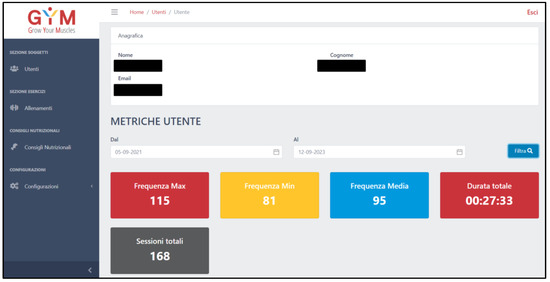 During the 48 weeks of the study, the participants randomized to the EG are equipped with a wearable device consisting of a heart rate (HR) band (Polar H9, Polar Electro 2011, Kempele, Finland), which is connected via Bluetooth to the participant’s smartphone. Participants are instructed to wear the HR band at the chest prior to the start of each training session to measure maximal, minimum, and average HR, which will be sent to the GYM website at the end of each training session. Through the GYM website (https://gym.visionage.it/#/login), the study supervisors (MB, FM) can remotely monitor adherence for each EG participant, by recording the number of training sessions performed, the training time of each session, and the effective training protocol execution, by recording the maximal, minimum, and average HR (Figure 2).