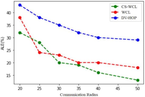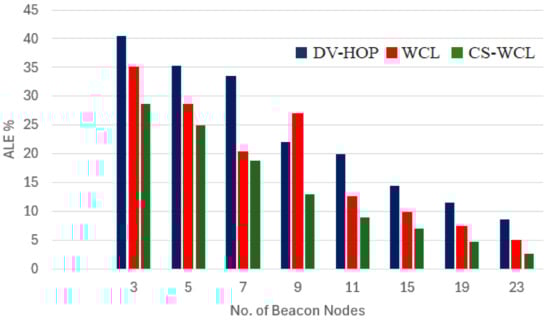 The ALE caused by changing the node′s communication radius is shown in Figure 4. For the communication ranges of 20 m and 45 m, the ALE for CS-WCL noted was 32% and 15%, respectively. The reason for the reduced ALE in CS-WCL is that the relevant anchor nodes were selected by crow search within the communication radius. Regarding DV-Hop and weighted centroid for the same communication ranges of 20 m and 45 m, the ALE computed was greater when compared to that for CS-WCL, although the LE decreased with the nodes’ communication radii, as shown in Table 3. For the communication radii of 20 m and 25 m, the ALE drastically reduced in CS-WCL because the nodes were placed randomly in the region. The main reason for the increased ALE in DV-Hop and WCL when compared with the proposed CS-WCL is that in DV-Hop, only the DV is considered during the localization process. In WCL, although the weighted centroid of all beacon nodes is considered, it is not optimal because the beacon nodes are selected without any specific metric. Overall, when the ALE was compared for all the algorithms with respect to the increase in communication radii, the proposed CS-WCL performed better. Because more neighbor nodes can participate in the localization process with a larger communication range, position estimates will be more accurate. The same is shown in Figure 2.