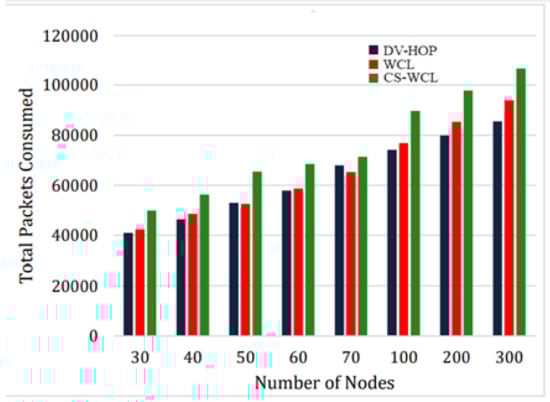 In the proposed CS-WCL, beacon nodes can communicate with nearby nodes if they are under a specified threshold limit. The DV-Hop localization technique involves the participation of all beacon nodes in the network, which reduces the need for pre-communication control packets. However, with CS-WCL, only the beacon nodes that fall inside the communication radii are considered for localizing unknown nodes. This is evident in the work’s performance, as depicted in Figure 6. Out of the 300 nodes in the network, around 7% of them were chosen as beacon nodes. Around 100,000 packets were used in the process of identifying an unknown node. In some instances, there was a slight rise in packet consumption, but it was insignificant when compared to WCL. This was due to the need for extra communication packets during the beacon selection process. CS-WCL enables the WSN to identify the most effective subset of beacon nodes that can optimize network performance while minimizing energy usage. CS-WCL achieves energy efficiency by optimizing the selection of beacon nodes, which results in reduced energy usage even with a higher number of packets being used. CS-WCL exhibited the lowest energy use, as depicted in Figure 7, despite having the largest total number of data packets consumed, as depicted in Figure 6.