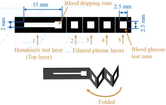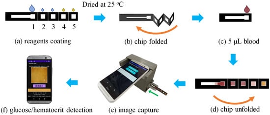 To address these requirements, this study proposes a portable, low-cost, point-of-care (POC) system for the simultaneous detection of blood glucose and hematocrit in whole human blood samples. The system comprises an origami μPAD fabricated using a commercial label printing machine and a 3D-printed optical cassette to facilitate detection using a commercial smartphone. The origami μPAD contains a single hematocrit test layer and four plasma filtering layers to improve the color uniformity and intensity of the blood plasma, thereby enhancing the detection accuracy. The hematocrit test layer is pretreated with sodium chloride (NaCl) and Tween 20 solutions, which prompt the dehydration of the red blood cells (RBCs) and suppress their flowability in the hematocrit test layer. Thus, the plasma flows ahead of the RBCs and is effectively separated from the whole blood sample. As the plasma flows along the hematocrit test layer, it also penetrates through the chip to the lower layer, where it reacts with embedded colorimetric assay reagents to produce a yellowish-brown complex. Once the reaction is complete, the paper chip is inserted into the optical cassette and observed using the camera of a commercial smartphone. The hematocrit content is quantitatively determined by measuring the plasma wicking distance along the upper layer of the origami μPAD. Additionally, the glucose concentration is derived by analyzing the RGB intensity of the reaction complex using self-written RGB program installed on the phone as an app. The accuracy of the blood glucose measurements is enhanced by illuminating the detection region of the paper chip with LED lights built into the 3D-printed cassette to minimize the effects of ambient lighting variations.