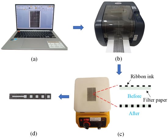 The origami μPADs were fabricated using a label printing technique, as shown in Figure 2. The μPAD layout was designed using label printer editing software (BarTender 2021 UltraLite Edition, Seagull Scientific, Washington, DC, USA) (Figure 2a), with multiple μPADs placed side by side on a single page to facilitate mass production. The μPADs were printed using a commercial label printer (TTP-345, TSC Printronix Auto ID, New Taipei City, Taiwan) that transferred a thermal transfer ribbon (EG-18, DNP, Tokyo, Japan) to the surface of a piece of filter paper (Advantec No. 1, ADVANTEC, Kashiwa, Japan) (Figure 2b). After printing, the filter paper was heated on a hotplate at 170 °C for 15 min to allow the ribbon to permeate through the paper thickness, thereby creating hydrophobic boundaries that replicated the μPAD design (Figure 2c). Finally, the filter paper was cut into individual paper-based chips for experimental testing (Figure 2d).