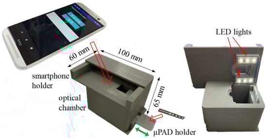 Smartphones provide a low-cost and effective technique for μPAD-based colorimetric detection [47,48]. However, when using smartphones to determine the color intensity of a reaction complex, variations in the ambient light conditions may affect the detection performance. In the present study, this problem was addressed using the optical cassette shown in Figure 3, consisting of a smartphone holder, an optical chamber, and a μPAD holder. The cassette was fabricated using a 3D printer (Original, Snapmaker, Shenzhen, China) and was fitted with six LED lights with a 5500 K color temperature to enable accurate and precise color intensity detection.