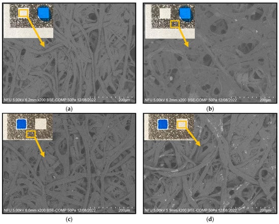 As described in Section 2.2, the hydrophobic barriers in the μPAD were patterned using ribbon ink and a commercial label printer (TTP-345, TSC Printronix Auto ID, New Taipei City, Taiwan). With a resolution of over 300 dots per inch (dpi), the printer ensured excellent precision and repeatability of the produced μPADs by uniformly distributing the ribbon ink on the surface of the filter paper. Figure 5a–d show the results obtained from hydrophobicity tests performed using blue dye following various treatments of the filter paper. Figure 5a,b show the surfaces of the filter paper before and after printing, respectively. In the former case, when blue ink was dropped on the reaction zone of the filter paper, it seeped beyond the boundaries of the reaction area owing to the lack of hydrophobic barriers (Figure 5a). During the printing process, the filter paper passed through a fusion unit inside the label printer, which partially melted the toner microparticles and bound them to the surface. However, the short heating time was insufficient to impregnate the hydrophobic ribbon ink through the thickness of the paper substrate. Thus, the blue dye again seeped beyond the boundaries of the reaction region (Figure 5b). Figure 5a,b also present SEM images (200× magnification) of the filter paper morphology before and after printing, respectively. The non-printed paper had a porous fiber structure, as shown in Figure 5a. It was thus naturally hydrophilic and allowed the dye to flow easily through the paper structure under the effects of capillary action. During the printing process, ribbon ink was applied to the surface of the filter paper. However, no significant change in the paper morphology occurred (Figure 5b). Hence, the blue dye was again able to seep beyond the printed boundaries.