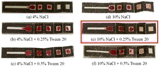 In the proposed μPAD, the hematocrit and glucose detection performance is fundamentally dependent on the efficiency of the plasma separation process. Therefore, a preliminary investigation was conducted using animal (sheep) blood to determine the optimal composition of the NaCl/Tween 20 reagent coated on the first three reaction layers of the μPAD (Figure 4a). As shown in Figure 6, six reagent solutions with varying concentrations of NaCl and Tween 20 were prepared. For each mixture, 5 μL of reagent solution was applied to reaction zone 1, while 1 μL was applied to reaction zone 2 and reaction zone 3.