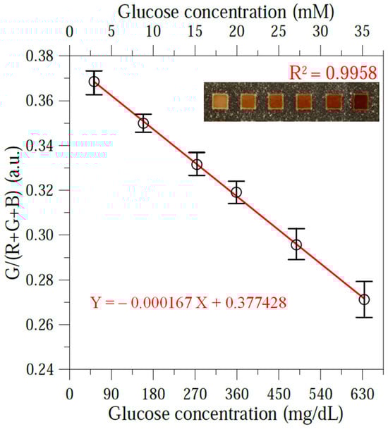 The glucose determination performance of the μPAD system was investigated by diluting sheep plasma samples with PBS to obtain control samples with glucose concentrations ranging from 45 to 630 mg/dL, covering the full clinical range associated with normal and diabetic glucose levels. For each sample, the R, G, and B intensity values were independently measured at least five times to ensure the reliability of the results. An analysis of the measured R, G, and B values indicated that the intensity ratio of G/(R + G + B) provided the best fit with the glucose concentration of the control samples. As shown in Figure 8, the optimal calibration equation was determined to be Y = −0.000167 X + 0.377428, with a near-ideal correlation coefficient of R2 = 0.9958. The μPAD system has a detection sensitivity of 0.000167 (a.u.)/(mg/dL), indicating an ideal inverse proportional relationship. Thus, the formula was implemented in the second app on the smartphone to facilitate the glucose determination of unseen blood samples. The limit of detection for glucose detection was calculated to be around 4 mg/dL using the mean (blank) + 3SD (standard deviation) [53], which is comparable to previously reported colorimetric methods (1.8–19.8 mg/dL) [21,54].