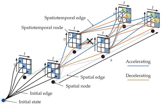 One of the most widely used graph search algorithms is the Dijkstra algorithm [22,23,24], which aims to find the desired path from the starting node to the goal nodes by progressively expanding the edges, maintaining a set of nodes awaiting exploration during searches. At each step, it selects the node with the smallest cost from the starting node for expansion. The primary limitations of this algorithm lie in its inability to handle graphs with edges of negative weights and its tendency to equally explore edges in different directions, often disregarding the relationship between new nodes or edges and the goal nodes. These limitations may lead to computationally intensive problems. However, the algorithm’s flexibility in designing costs allows it to effectively address multi-objective trajectory planning problems without the requirement for the differentiability or continuity of optimization objectives. The uniform-cost search (UCS) algorithm shares nearly identical principles with the Dijkstra algorithm but can provide feasible suboptimal solutions before reaching the final optimal solution [25], making it suitable for planning tasks with limited computational resources. Figure 2 demonstrates the spatio-temporal search graph utilized in [25] for trajectory planning tasks on structured roads. The problems involved in spatio-temporal trajectory planning tasks are further discussed in Section 2.7.