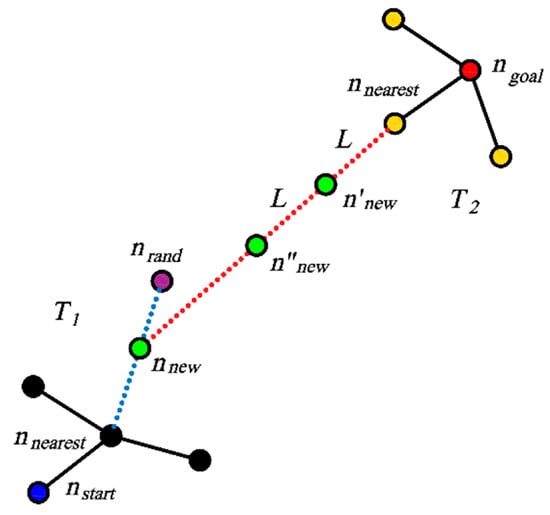 Random sampling algorithms are still search-based planning algorithms, requiring the construction of a search graph or a search tree during the planning process. Algorithms based on search graphs include the Probabilistic Roadmap (PRM) algorithm [41] and its derivative, the PRM* algorithm [42], searching paths between the starting and end points by the randomly built maps in the state space. The primary challenge faced by PRM algorithms is the complexity of obstacle collision detection and the significant computational time it consumes. In practical applications, a “lazy” approach is often adopted, deferring collision detection steps by first searching for trajectories and then verifying their feasibility [43]. In contrast, Rapid-exploring Random Tree (RRT) algorithms [44], and other search-tree-based random-sampling algorithms derived from them, have gained more widespread application. PRM and RRT algorithms are probabilistically complete. That is, under the condition of a sufficient number of samples, planning problems with feasible solutions can be solved by these algorithms. Commonly used improvement algorithms include the RRT-connect algorithm [45] or Bi-RRT algorithm [46], which simultaneously generate two search trees from the starting and end nodes, as demonstrated in Figure 3, significantly improving the search efficiency.