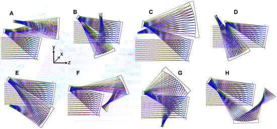 Folding geometries for a three-mirror imager with reimaging. Each different folding geometry (A–H), is considered distinct because the secondary or tertiary mirror is tilted in a new direction or the image plane crosses over the incoming ray bundles. These systems have only spherical surfaces and are not yet optimized for image quality. These systems operate at F/3 with a 250 mm entrance pupil and a 2° × 2° full FOV. Each ray bundle of a certain color corresponds to a specific point in the FOV.