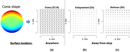 The resulting aberrations from adding a freeform coma shape to a surface in the optical system are shown here in aberration full-field displays, as predicted by the aberration theory of freeform surfaces [27]. When the coma surface is located at the aperture stop, only (a) field-constant coma is produced. When the coma surface is moved away from the aperture stop, (a) field-constant coma, (b) field-asymmetric, field-linear astigmatism, and (c) focal plane tilt are produced.