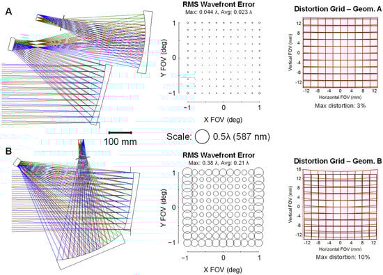 Optimized designs using freeform surfaces for Tier 1 Geometry (A) and Tier 2 Geometry (B). These were the only two FGs to achieve <0.25 waves’ average RMS WFE at a volume of 70 L. The RMS WFE of Geometry A is ~9× better than Geometry B. Distortion grids for both designs indicate that Geometry A has approximately 3× lower distortion.