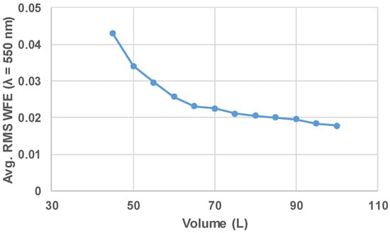 The average RMS WFE is plotted vs. the system volume for the Tier 1 FG (Geometry A). Volumes below 45 L were unable to be optimized to have diffraction-limited performance over the full FOV.