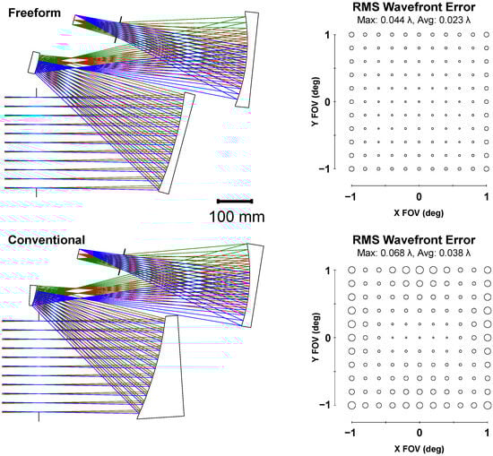 A comparison of the (top) freeform solution to the (bottom) conventional solution using off-axis aspheres. Each design fits within a 70 L volume. The freeform design has a 39% better average RMS WFE and a 35% better maximum RMS WFE compared to the conventional design with equivalent specifications.