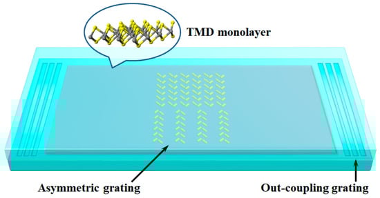 Multiple efficient OAM sorting methods have been demonstrated in bulky systems [26,27,28]. For on-chip detection, several strategies have been proposed in the realm of classical optics [29,30,31,32]. The most effective method is using an asymmetric grating design [30], which can also be adopted to measure OAM entangled states. However, this method is inapplicable to the analysis of SAM; thus, additional design is necessary. In fact, TMD monolayers support spin-polarized valley transitions at the K and K’ points of the associated Brillouin zone owing to the broken inversion symmetry combined with time-reversal symmetry [33,34,35], which leads to the chiral coupling of spin photons. Nevertheless, as we need to combine the OAM degree of freedom, a more flexible scheme to deal with both SAM and OAM simultaneously is desired. Here, we choose to introduce spin Hall nanostructures [31,36] into the asymmetric grating for sorting SAM. Correspondingly, the schematic of a hybrid metadetector consisting of a TMD monolayer integrated with asymmetric grating consisting of spin Hall nanoantenna arrays is shown in Figure 1.